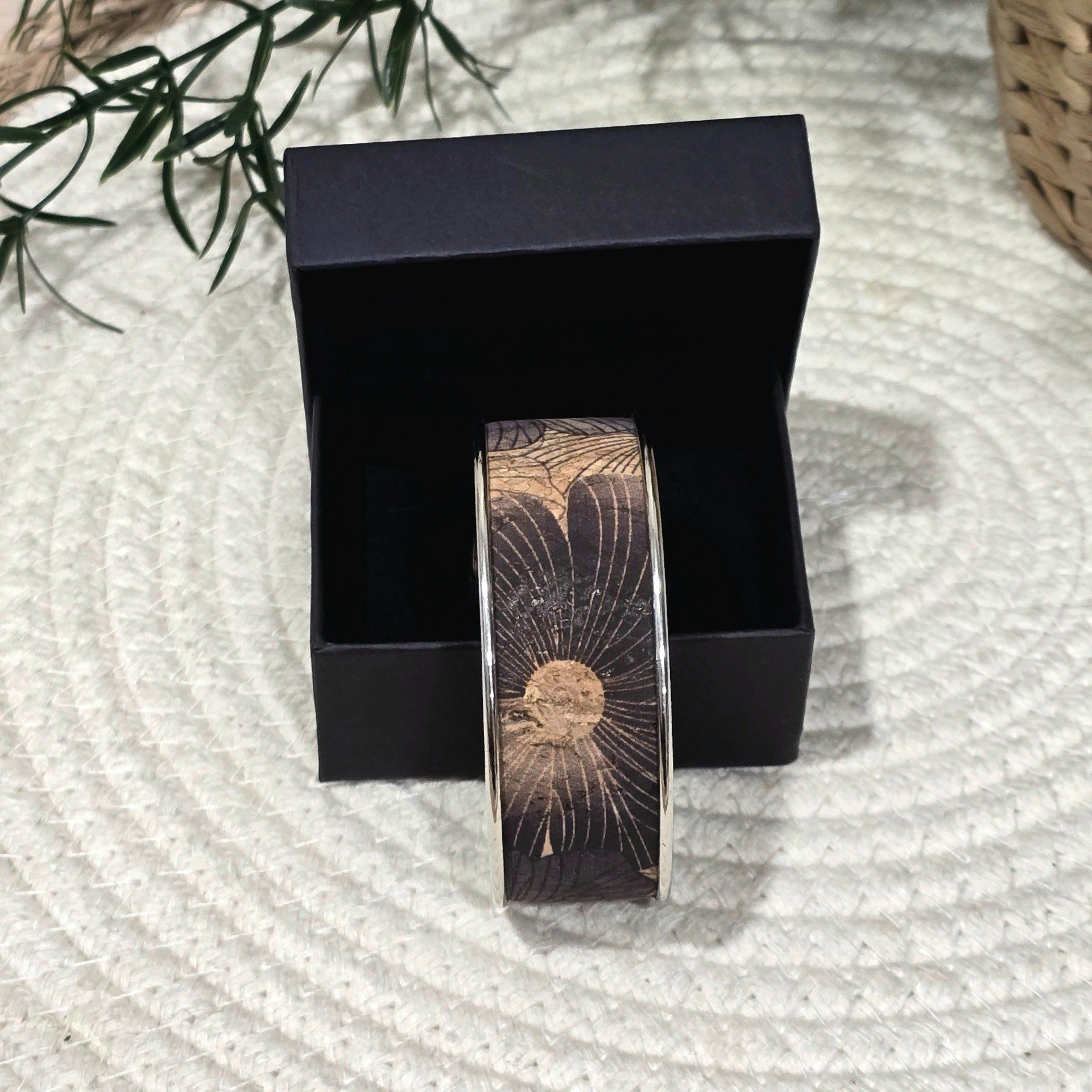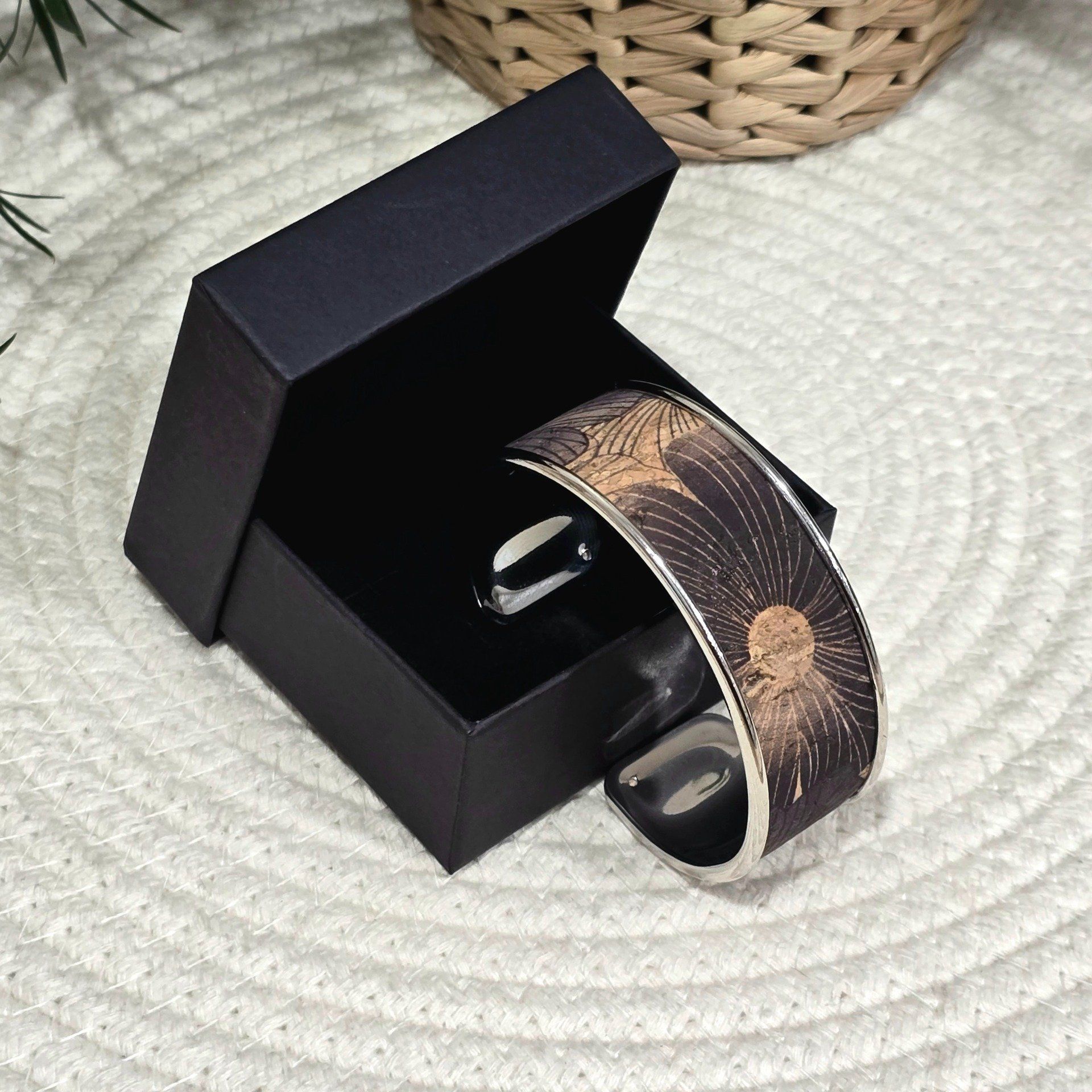 Bracelet manchette 20 mm argenté et liège imprimé fleurs