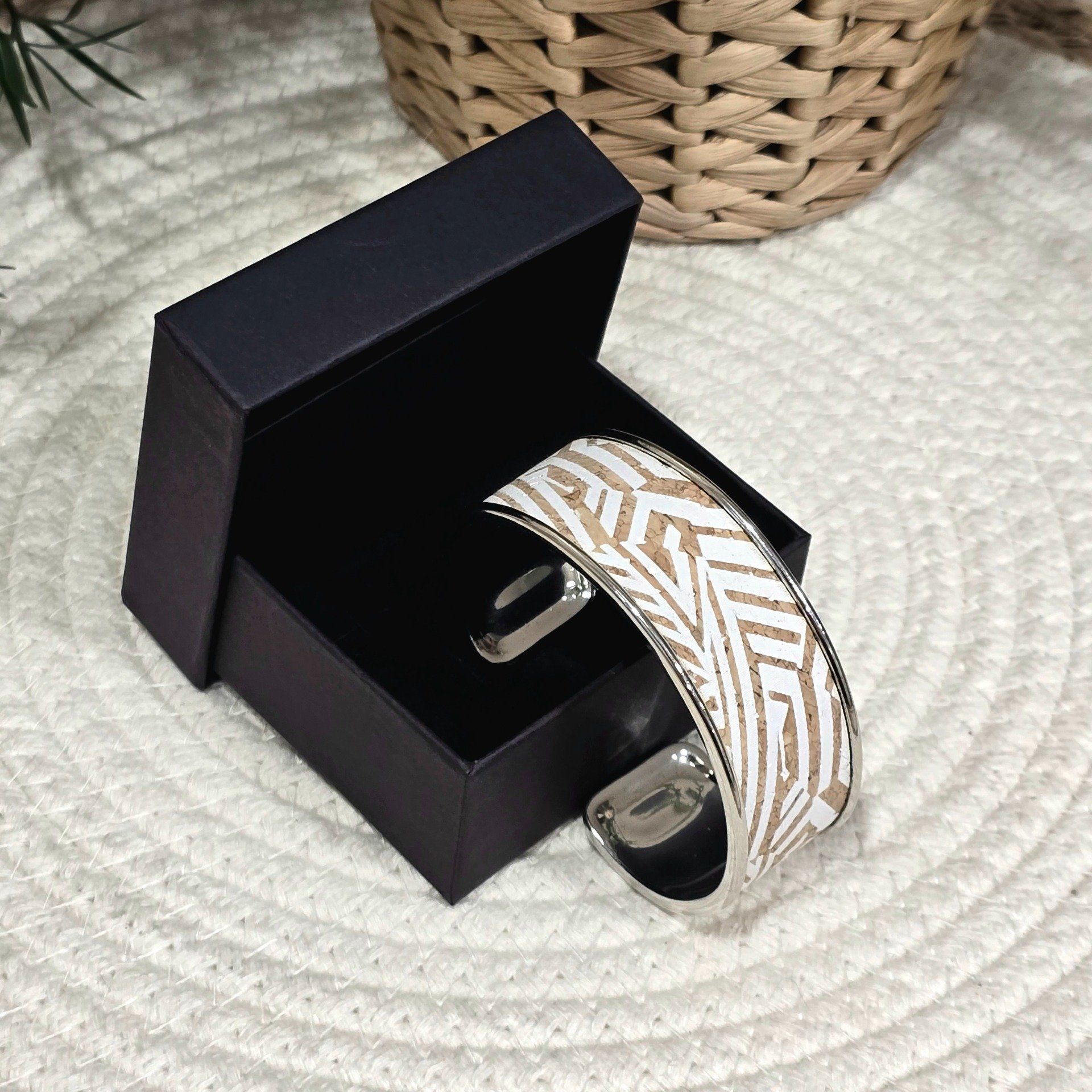 Bracelet manchette 20 mm argenté et liège motifs blancs