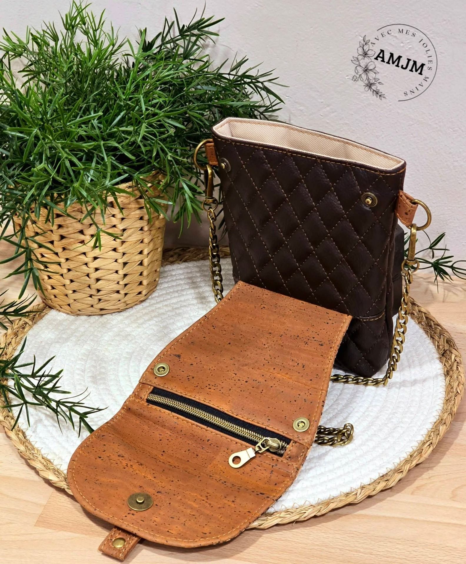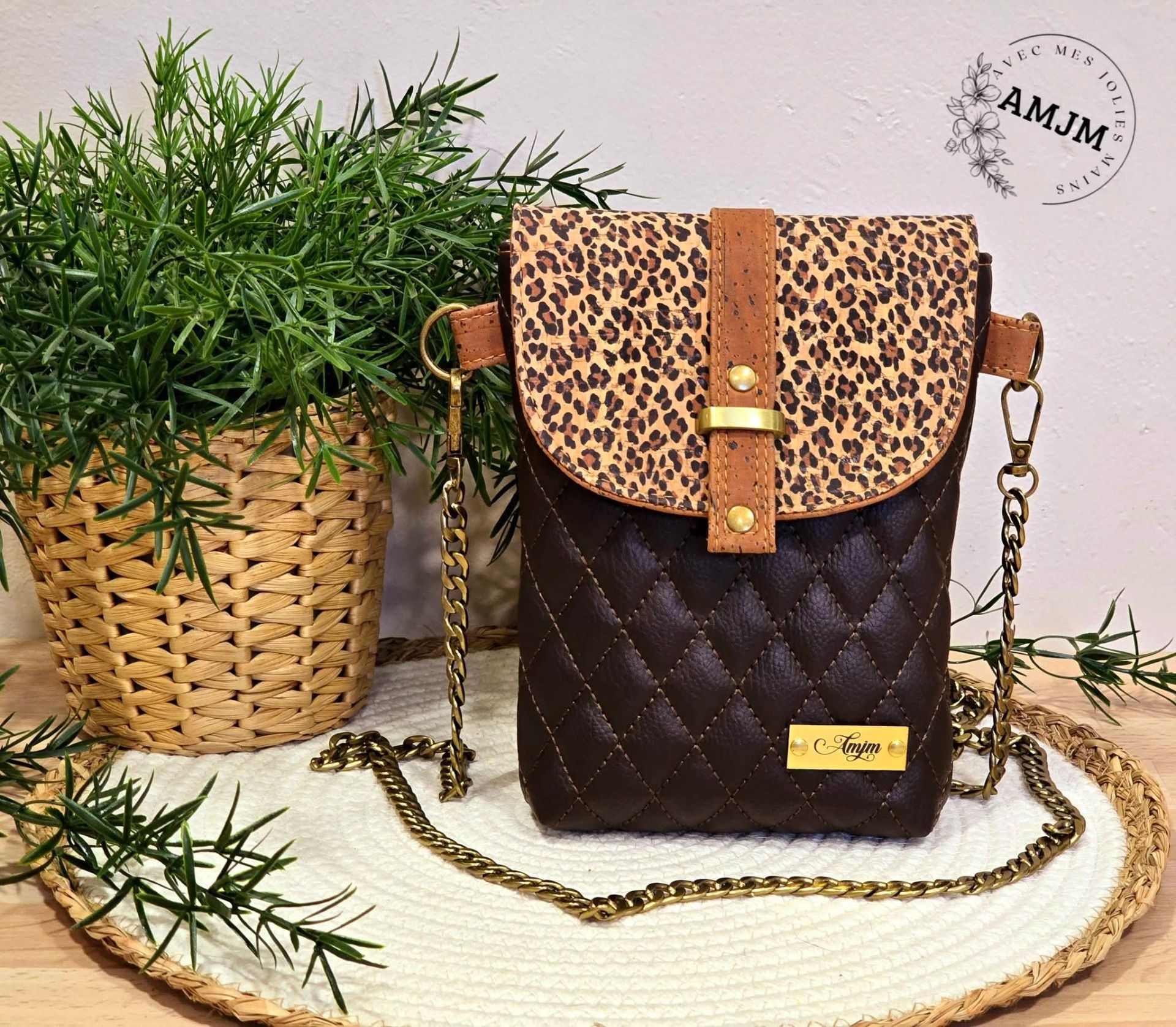 La pochette est conçue avec un simili matelassé marron foncé et du liège marron, apportant à la fois une texture riche et un aspect durable. L'imprimé léopard en liège ajoute une note audacieuse et originale, parfaite pour celles qui aiment se démarquer.