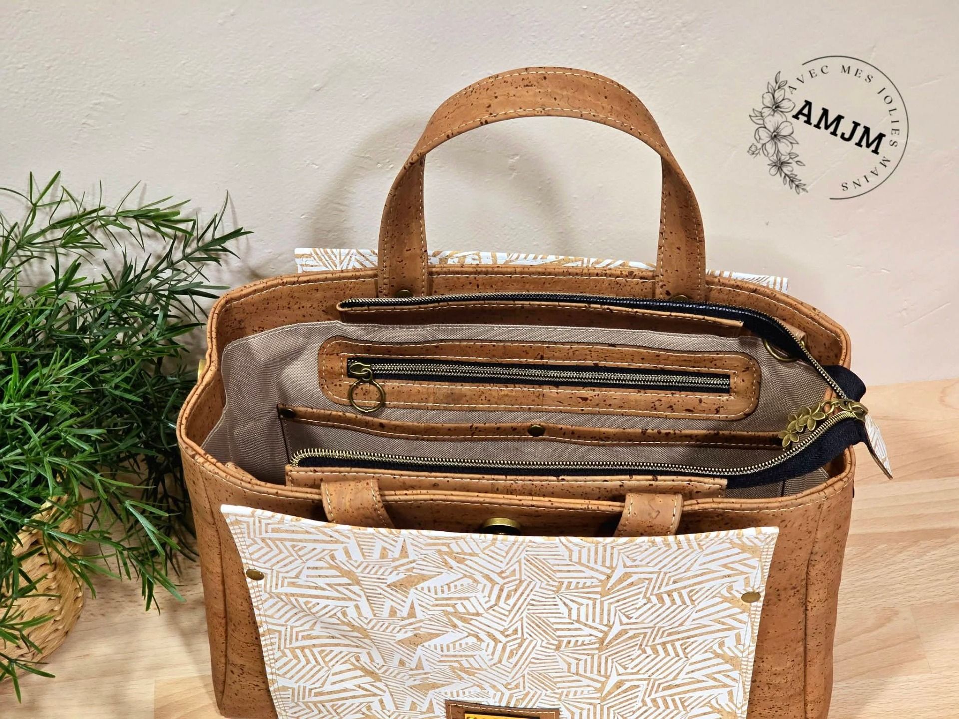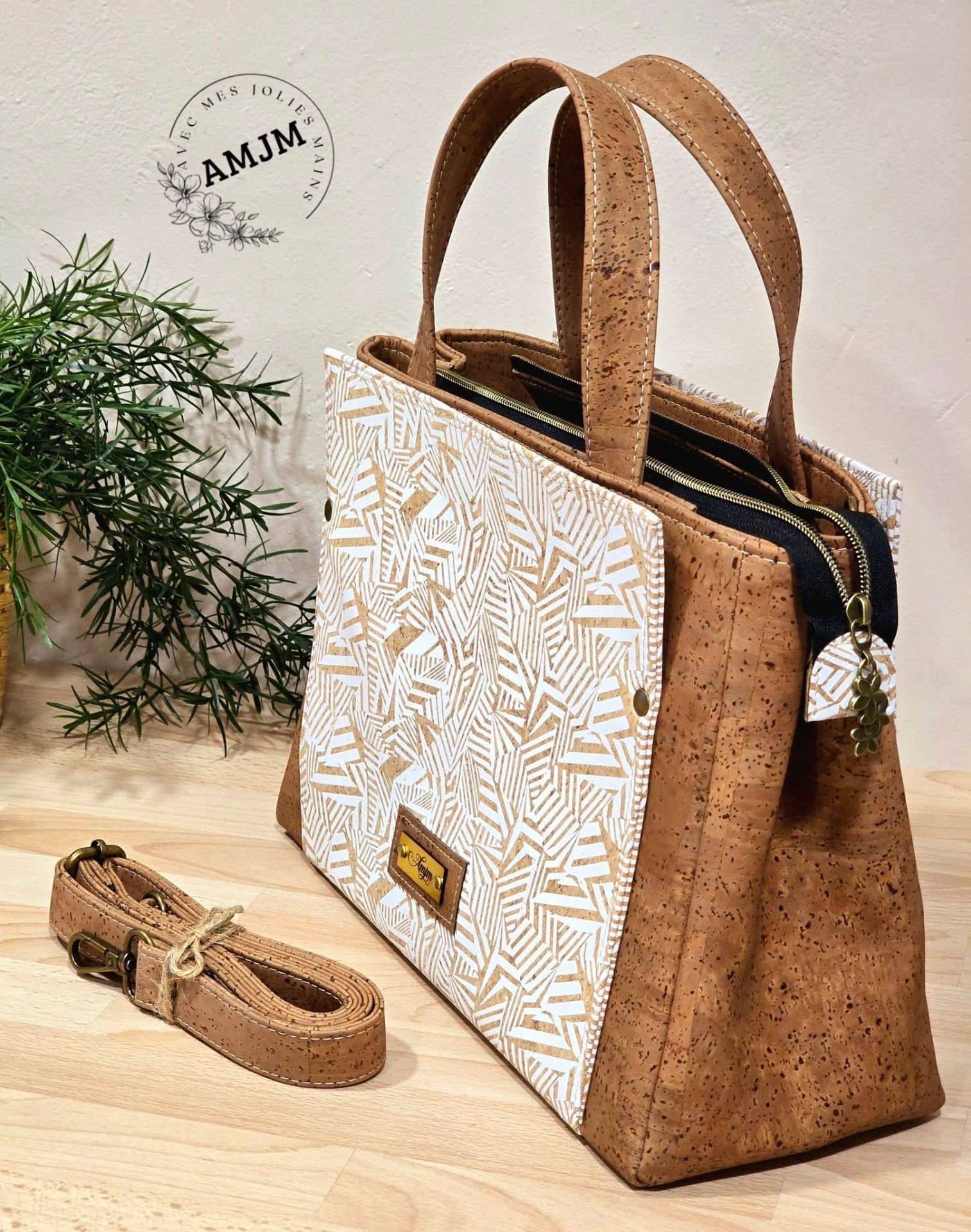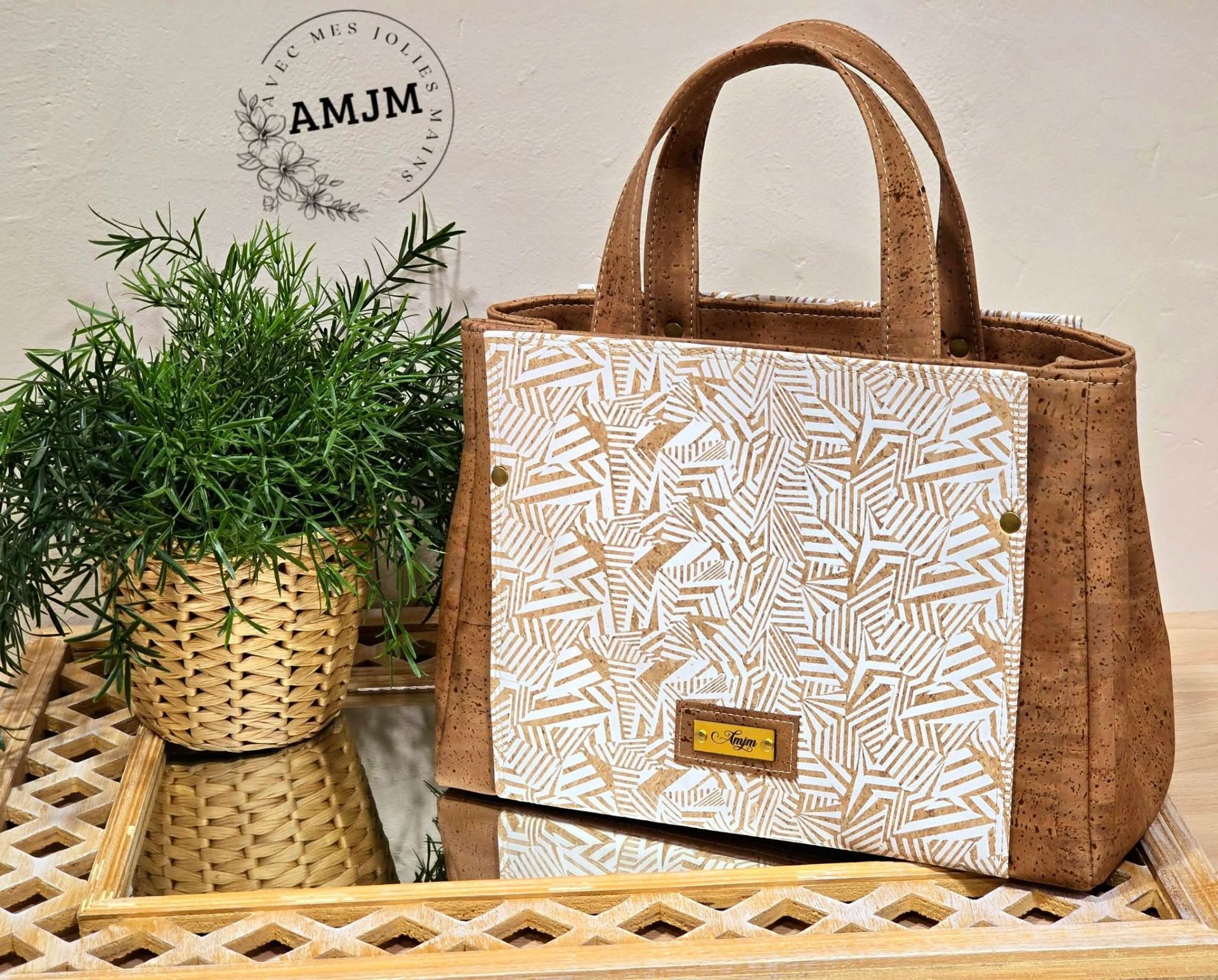 Découvrez ce magnifique sac Charyn alliant élégance et praticité en liège marron tabac et liège motifs géométriques blancs.